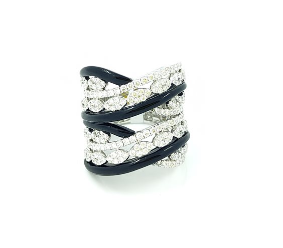 Anello di creazione artigianale in Oro Bainco 18kt. con inserti di Ceramica Nera e Diamanti a taglio brillante 1.79ct.
