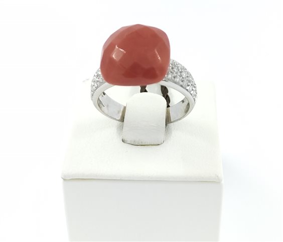 Anello Artigianale in Oro Bianco 18kt, con Corallo Rosso, e Diamanti a taglio brillante 0.38ct.