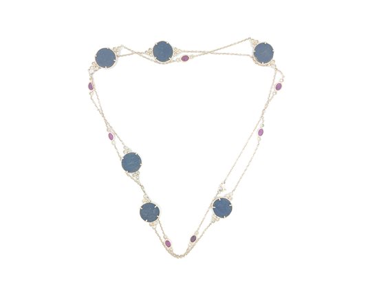 Collana in Oro Rosa 18Kt. con monete antiche, diamanti a taglio brillante da 3.62 ct. e Rubini da 4.96 ct. lunghezza 115cm