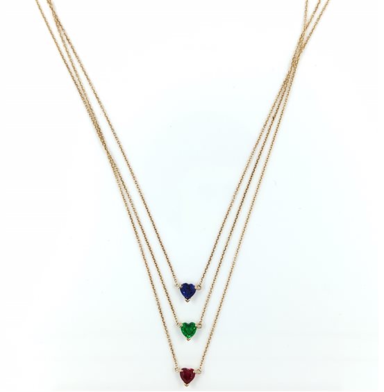 Collana di creazione artigianale Preziosi Sangiorgi, in Oro Rosa 18kt. con pendenti di tre tipologie, questa collana si può avere con pendente: Smeraldo 0.44ct. Rubini 0.68ct. Zaffiro 0.64ct.