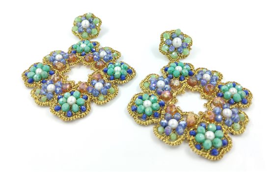 Orecchini artigianali in lavorazione Chiacchierino, con cristalli e perle di acqua dolce e agata verde.