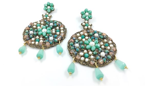 Orecchini artigianali in lavorazione Chiacchierino, con perle di acqua dolce e cristalli e pietre acqua-mare ecologiche.