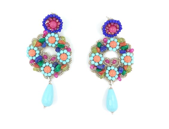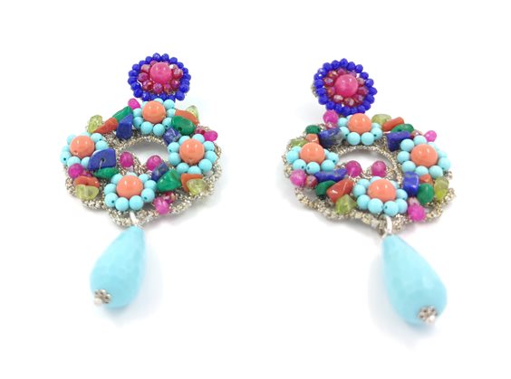 Orecchini Artigianali in lavorazione Chiacchierino con pasta di turchese e corallo e agata blu.