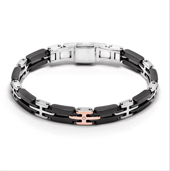 Bracciale in acciaio lucido e ceramica nera, inserto centrale in oro rosa 7501000 diamante da Ct 0,01