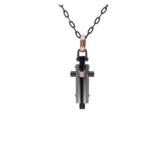 Gioiello Baraka, Collezione Discovery, Collana in acciaio con finitura PVD nero. Pendente croce in acciaio con dettagli con finitura PVD nero e inserti in oro rosa e diamante, lunghezza 50 cm