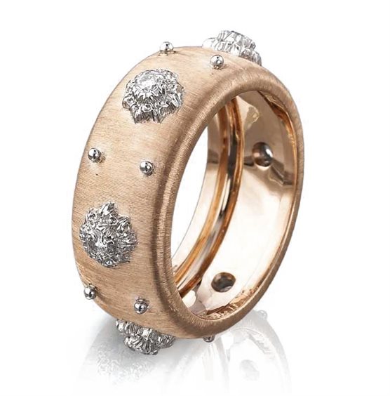 Anello Bucellati in oro rosa con castoni in oro bianco con diamanti incastonati.