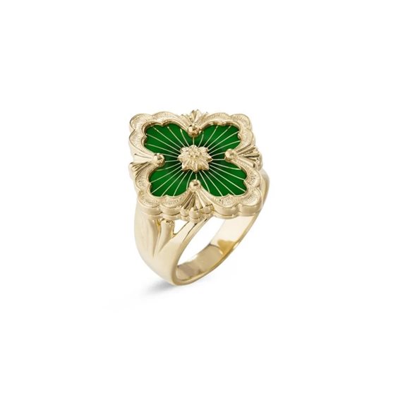 Anello Opera Tulle composto da un elemento logo in oro giallo, sfondo in smalto verde sormontato da tulle a raggiera con, al centro, una rosetta in oro giallo. Bordi smerlati a forma di ventaglio e palline lucide in oro giallo.
