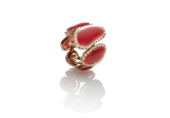 Anello fascia in oro rosa, cinque elementi in corallo rosso e diamanti bianchi