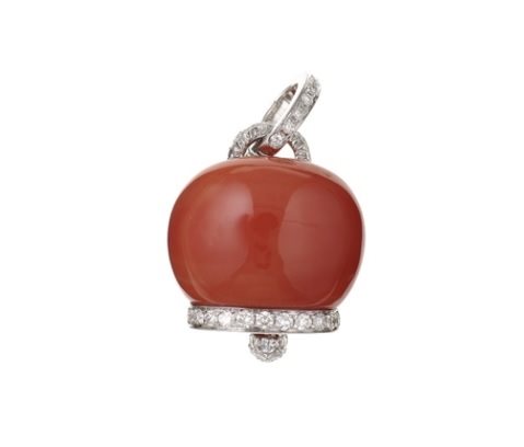 Ciondolo Campanella grande in oro bianco 18Kt, diamanti e corallo rosso.