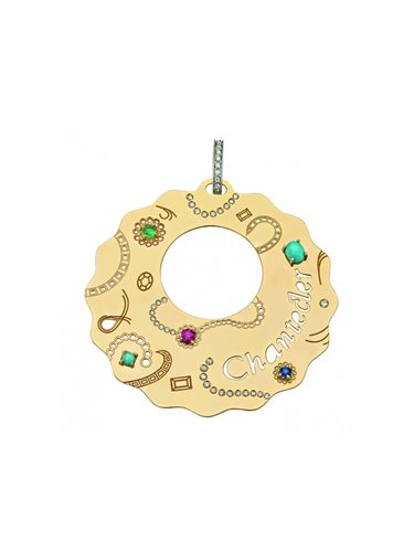 Ciondolo maxi in oro giallo 9 kt. con turchesi, zaffiri, rubini, smeraldi e diamanti.