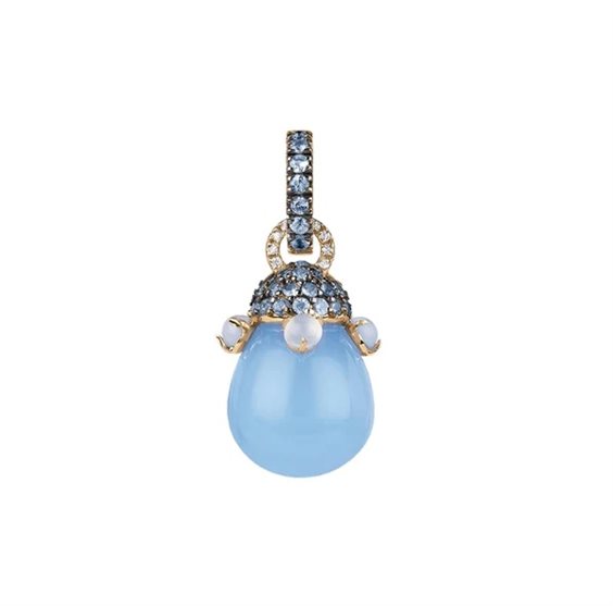 CIONDOLO JOYFUL IN ORO GIALLO 18KT, DIAMANTI, ZAFFIRI AZZURRI E POIRE IN CRISTALLO COLOR GLICINE. COMPOSIZIONE ORO GR 2,45 DIAMANTE CT 0,04 NR 9 ZAFFIRO CT 0,47 NR 28 QUARZO GR 2,68 NR 5