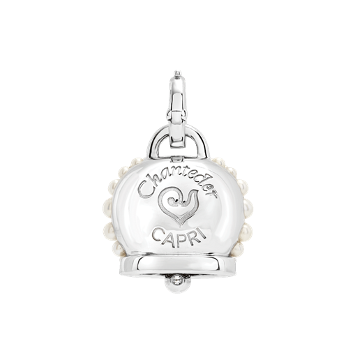 Oro GR 14,95 KT 18 Diamante CT 2,16 NR 61 Perle_CT GR 0,95 NR 12 Ciondolo Campanella grande, in oro bianco 18kt, perle FW, diamanti baguette, rose cut e tondi.