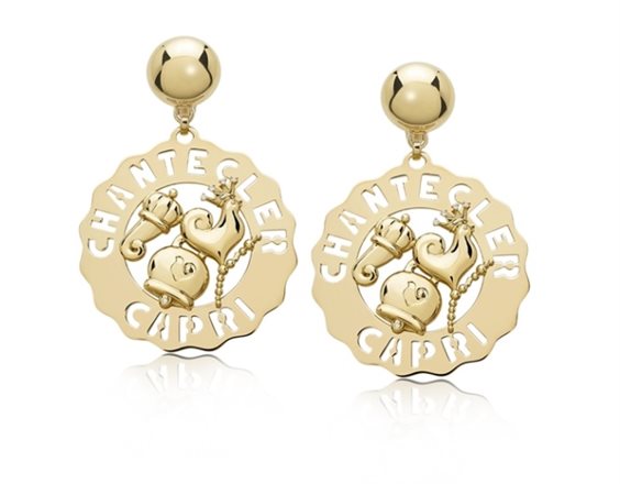Coppia Mono Orecchino Chantecler Logo grandi gallo, campanella, cornetto in oro giallo 18Kt e diamanti.