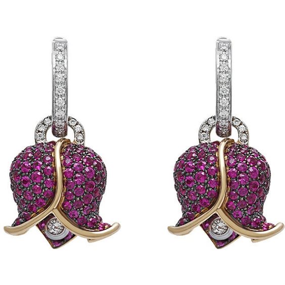 Coppia Mono Orecchino collezione Campanelle Chantecler. Campanella Chantecler a forma di Bouganville realizzata in oro rosa 18kt, diamanti per una caratura complessiva di 0,24 ct e pavè di zaffiri rosa per un totale di 2,12 ct.