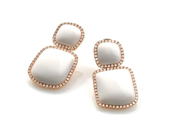 Coppia di Orecchini pendenti corti Enchanté in oro rosa 18Kt, due elementi in Kogolong e diamanti.