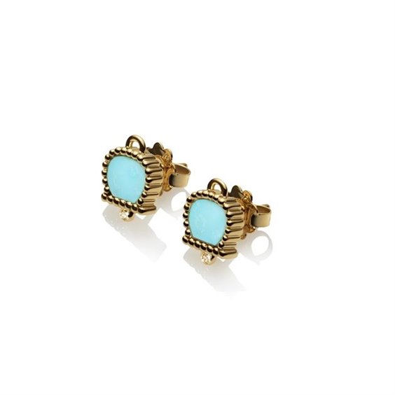 Orecchini a lobo in oro giallo, campanella micro in turchese e diamante.