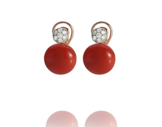 Coppia di Orecchini a lobo Bon Bon in oro rosa 18Kt, diamanti e corallo rosso.