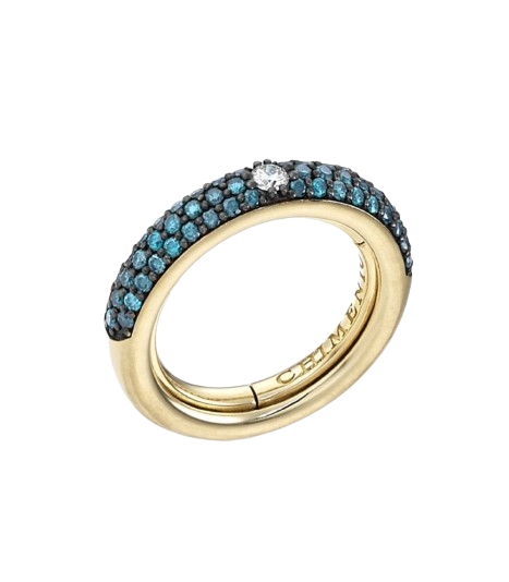 Anello Chimento in oro giallo 18 carati con diamanti blu da 0,68 carati e diamante bianco centrale da 0,09 carati della collezione "Forever" - Linea "Stack Me Demi Pavè". Peso totale dell'oro 5,80 grammi. Misura Anello 14. - Materiale: Oro Giallo 18kt. - Carati Totali Diamanti Blu: 0,68 carati - Carati Totali Diamanti Bianchi: 0,09 carati - Peso totale dell'oro: 5,80 grammi - Misura Anello 14