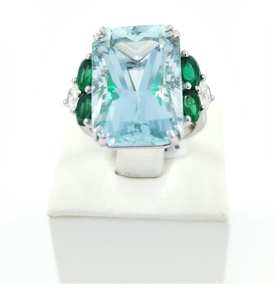 Anello Crivelli in Oro Bianco 18kt. con Pietra Centrale Acquamarina 14,87ct, Smeraldi laterali 1,43ct, e piete navetta laterali 0.48ct.