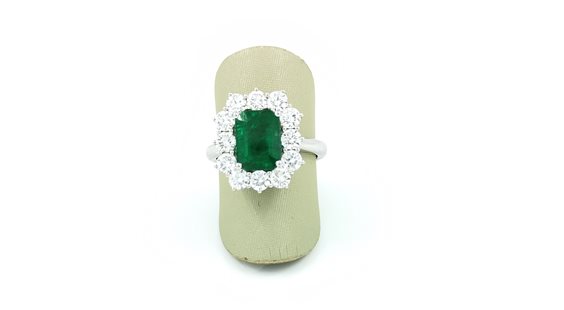Anello Crivelli in Oro Bianco 18kt. centrale in Smeraldo 2.29ct. con cornice di Diamanti a Taglio brillante 1.46ct.