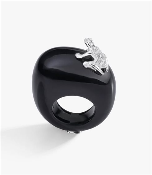 L'anello scultura dell'iconica collezione Happy Frog ha la base in argento 925 il cui colore nero è ottenuto mediante un trattamento di verniciatura manuale. La rana è in oro bianco 18k e diamanti. Una combinazione che conferisce al gioiello un design contemporaneo, frutto dell'unione tra lo slancio creativo e l'artigianalità orafa italiana. Un porte-bonheur, ideale per le occasioni in cui si vuole augurare il meglio alle persone a noi più care. Internamente una molla consente di ridurre la misura di 2 taglie. Dato l'ingombro dell'anello è consigliata una taglia più grande. Materiale: Oro bianco 18k e Argento 925 Pietre preziose: Diamanti 0.22 ct Collezioni: Happy Frog Altezza anello: 1,85 cm