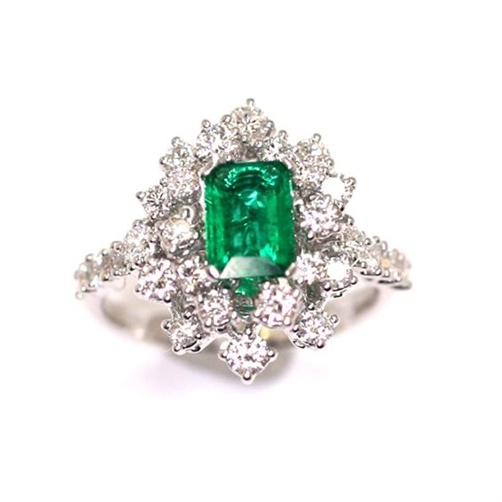 Anello in Oro Bianco 18kt. con Centrale in Smeraldo 0.97ct. e cornice di diamanti a taglio brillante 1.07 ct.