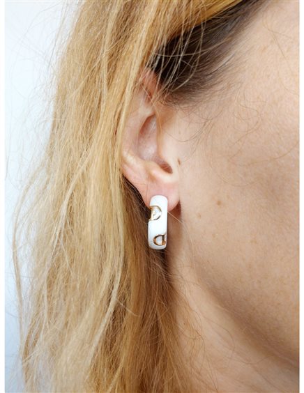 La collezione di gioielli D.Icon rappresenta l’ultima evoluzione di una lunga tradizione dei maestri orafi, che introducono la ceramica bianca, nera e cappuccino lucida nella lavorazione tradizionale dell’oro e dei diamanti creando una nuova iconica tendenza. Per contraddistinguere questi gioielli Damiani, il logo, la D maiuscola, è rappresentata sulla ceramica in oro pieno con diamante.Orecchini in oro rosa 750 e ceramica bianca a forma di anello con incastonato un diamante ct. 0.008