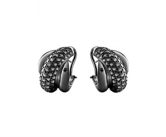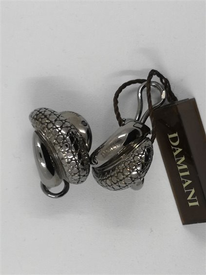 Questi orecchini in oro black 9 carati, appartengono alla linea Gomitolo, collezione Damiani in cui tre fasce d'oro si intrecciano impreziosendosi da un lato con la peculiare lavorazione a texture della fascia centrale e dall'altro grazie alla presenza di un diamante black per ciascun orecchino raggiungendo un totale pari a ct 0,02.