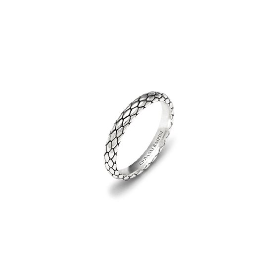 Un anello in argento brunito con decoro Texture che si adatta perfettamente alle molteplici sfumature della vita quotidiana. Una creazione elegante e minimale, evoluzione contemporanea dello stile assoluto di Giovanni Raspini. Realizzato completamente a mano in azienda con la tradizionale tecnica della fusione a cera persa.