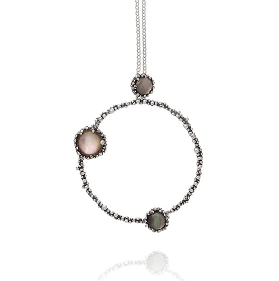 Sferette d'argento brunito si rincorrono con delicatezza e leggerezza in forme circolari e avvolgono madreperle doppiate con quarzo, dando vita a questo pendente. Nella Collezione Maui il fascino dell'argento incontra i riflessi opalescenti dell'alba sull'oceano di isole lontane per gioielli che vincono il tempo.