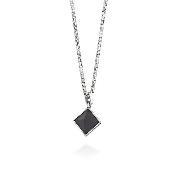 Il pendente di questa collana è una grande borchia in resina nera, inserita in un castone in argento brunito che riproduce la stessa forma anche sul retro. Un'eleganza fatta di contrasti, fra il nero della pietra e la luminosità dell'argento. Completa il gioiello una catena di 50 cm. Argento 925 e resina nera Lunghezza catena 50 cm Lunghezza pendente 1,2 cm Chiusura con moschettone Fatto a mano in Italia