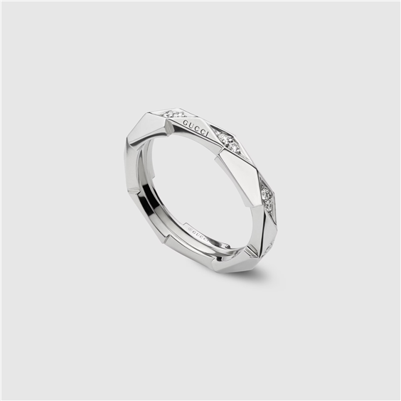 La linea Gucci Link to Love propone design contemporanei in varie finiture d'oro come parte della collezione Pre-Fall 2024. Caratterizzato da diamanti bianchi scintillanti e dal design borchiato che conferisce forma geometrica, questo anello è perfetto da indossare tutti i giorni. oro bianco 18 carati 16 diamanti bianchi, circa 0,171 carati Peso: circa 4,7 g Larghezza fascia: 0,4 cm