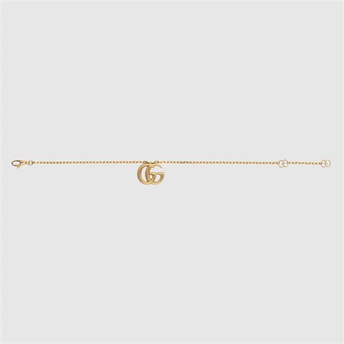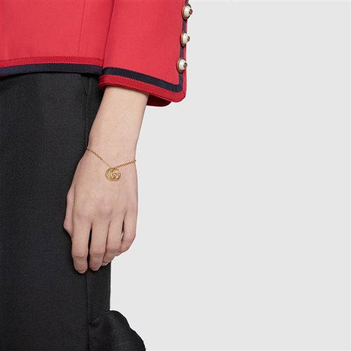 Evoluzione di un dettaglio proveniente dagli archivi Gucci degli anni '70, la Doppia G è riproposta nel ciondolo che orna questo bracciale in oro giallo 18 carati presentato nella sfilata Cruise 2018.