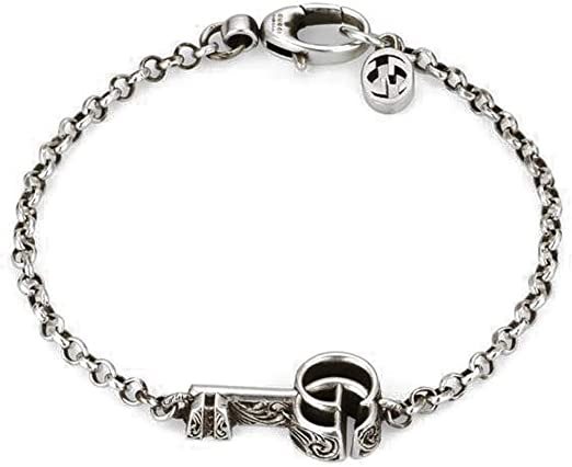 Questo bracciale in argento sterling, con una finitura anticata, presenta una chiave con l'ormai riconoscibile Double G come pezzo superiore. Realizzata con sapienza e design intricato, spesso con sottili cenno alla casa, la collezione di gioielli in argento di Gucci è presentata in una serie di pezzi moderni e classici. Argento sterling 925 con finitura invecchiata. Doppia chiave G con incisione arabesca. Chiusura con fibbia. Doppia chiave G: 2 cm. Made in Italy 18 cm.