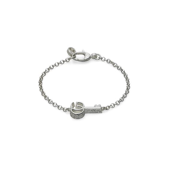 Questo bracciale in argento sterling presenta una chiave con la caratteristica Doppia G come parte superiore. Realizzata con estrema cura e con un design ricercato, con sottili richiami alla Maison, la collezione di gioielli in argento Gucci è presentata in una serie di modelli dal Flair Contemporaneo e classico. Argento 925, Pendente chiave con Doppia G e incisione, Chiusura a scatto, Chiave con Doppia G: 2 cm.