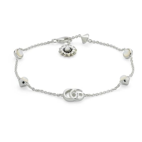 Da Gucci, i gioielli di moda GG Marmont fondono cristalli, accenti di perle e dettagli della Doppia G come ciondolo o lungo la catena di metallo in una collezione completa di pezzi. Questo delicato bracciale è presentato in argento sterling e arricchito da una Doppia G e dettagli in madreperla. 925 sterline d'argento Ciondolo Doppia G Dettagli in madreperla Chiusura a moschettone con fiore Lunghezza: 18cm