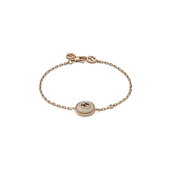 Il logo Interlocking G appare in nuove eleganti interpretazioni per la Pre-Fall 2024. Il raffinato oro rosa è completato da una pietra madreperla iridescente e da un pavé di diamanti. Questo bracciale a catena può essere abbinato ad altri accessori della stessa linea. - Oro rosa 18 carati e pietra madreperla - Catena con dettaglio Interlocking G - Ciondolo Interlocking G - 12 mm - 23 diamanti bianchi - circa 0,05 cttw - Chiusura a moschettone con Interlocking G - Peso - circa 0,008 libbre