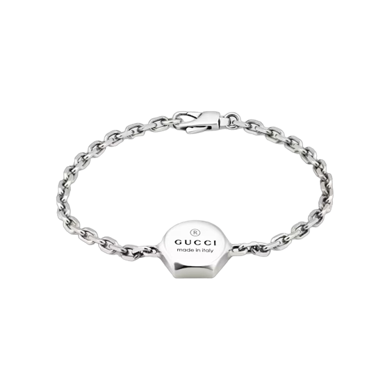 Realizzato in argento sterling 925, il logo Gucci in rilievo definisce questo braccialetto con un'esclusiva chiusura a cassetta. L'intricata catena incarna la narrativa della Maison e valorizza ulteriormente l'accessorio. - Incisione Gucci trademark - Chiusura a cassetta - Ciondolo: 14 mm