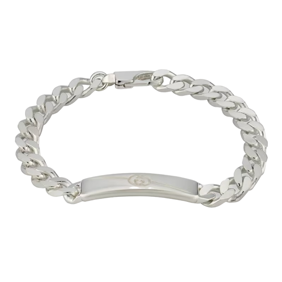 Questa stagione, l'Incrocio GG inciso diagonale viene proposto su gioielli in argento, come targhette, pendenti e anelli, mentre i materiali non metallici sono pelle e tessuto GG Supreme. Qui, questo bracciale con catena gourmette è realizzato in argento sterling 925 e presenta l'Incrocio GG inciso diagonale sul dettaglio della targhetta.
