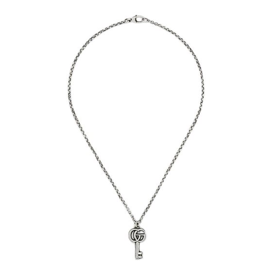 Questa collana in argento sterling, con una finitura invecchiata, presenta una chiave con l'ormai riconoscibile Doppia G come pezzo superiore. Realizzata con maestria e progettata in modo intricato, spesso con sottili cenni alla Maison, la collezione di gioielli in argento di Gucci è presentata in una serie di pezzi contemporanei e classici. Argento sterling 925 con finitura invecchiata. Ciondolo chiave doppia G. Incisione arabesca. Chiusura a moschettone. Lunghezza 50 cm. Pendente: 16,4 mm x 28,8 mm. Fatto in Italia