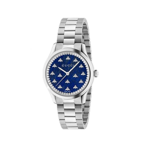 Orologio Gucci, Collezione: G-Timeless tipo di Movimento al Quarzo, Swiss Made con Quadrante in lapislazzuli blu scuro, arricchito da api argentate, con Cassa in acciaio, Ø 32 mm e Bracciale in acciaio regolabile da 130 mm a 175 mm con Chiusura fibbia pieghevole in acciaio il Vetro è in zaffiro con rivestimento antiriflesso, impermeabilità fino a 5 ATM Garanzia: 2 anni.