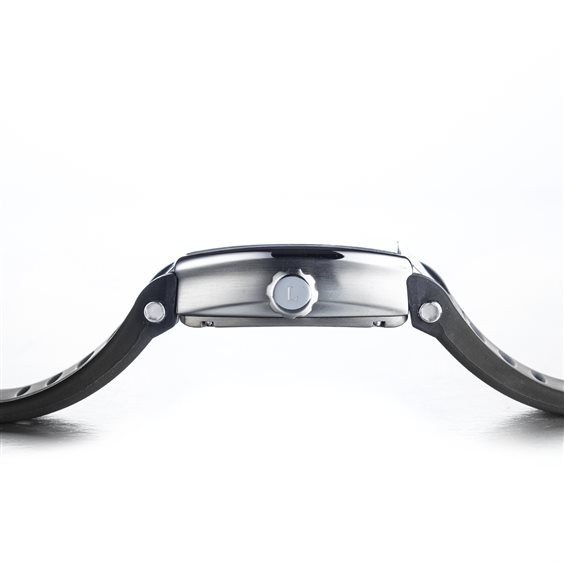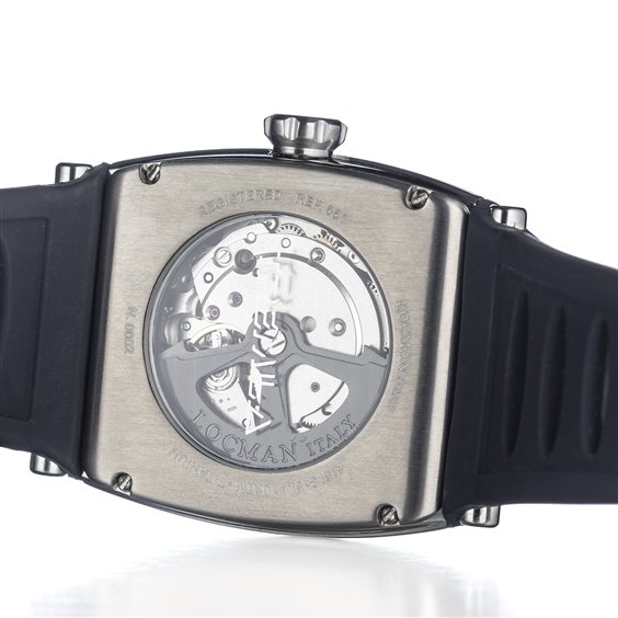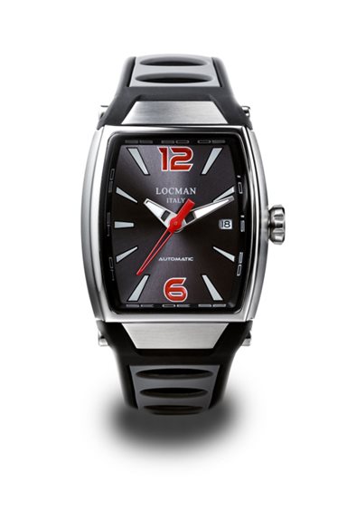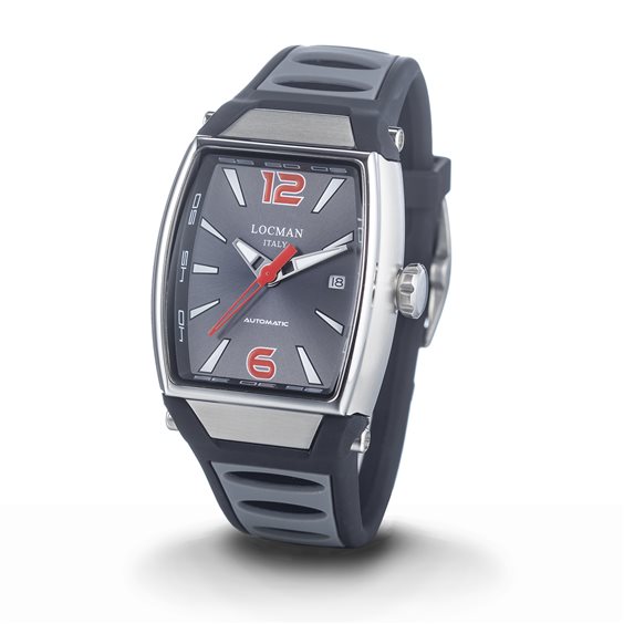Orologio Locman Tremila. Cassa mm 50 x 38 in acciaio 316L, fondello trasparente. Cinturino in silicone nero e grigio, chiusura a fibbia. Quadrante grigio scuro con dettagli bianchi e rossi., datario al 3. Movimento automatico a vista. Corona a vite, vetro minerale trattamento zaffiro. Impermeabilità 10 atmosfere. MADE IN ITALY