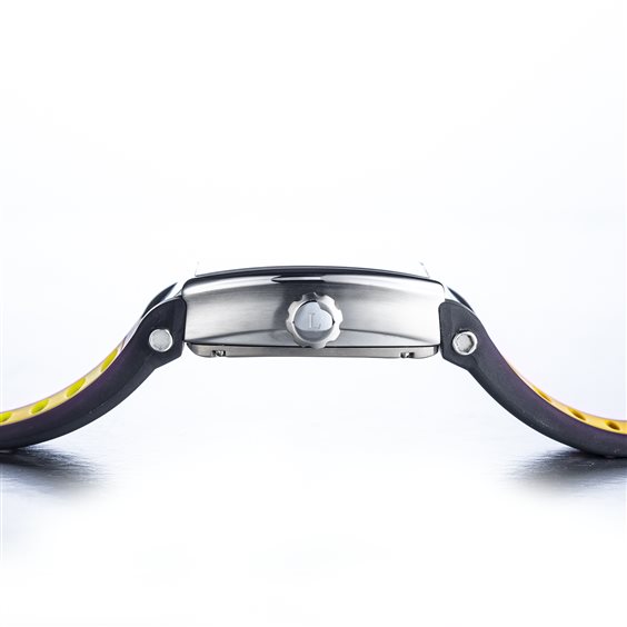 Orologio uomo , movimento al quarzo solo tempo , cassa in acciaio e titanio mm 50x38 , quadrante nero , indici bianchi e gialli , datario , corona a vite , vetro minerale antigraffio con trattamento zaffiro , fondello in titanio con numeri seriali di produzione incisi , cinturino in silicone nero e giallo. Immagine indicativa , la confezione può variare di forma e colore.