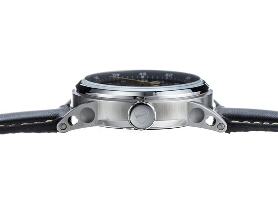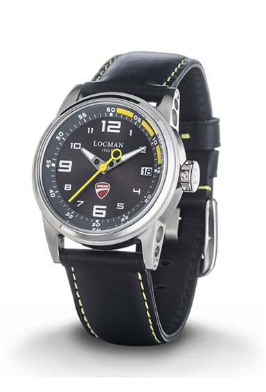 Orologio Locman Ducati. Cassa mm 50 in acciaio, fondello in titanio, cinturino in pelle nero con cuciture gialle, chiusura a fibbia. Quadrante nero con indici stampati e dettagli gialli, datario al 3, logo Ducati al 6. Movimento solo tempo al quarzo. Impermeabilità 5 atmosfere. MADE IN ITALY