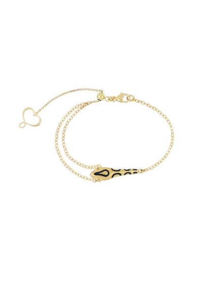 Bracciale realizzato in argento 925 con galvanica oro giallo ad alto spessore e resistenza. Presenta una testa di serpente con striature nere al centro. Può essere regolato fino ad un massimo di 18 cm grazie alla piccola sfera scorrevole. È presente il cuore Maman traforato all'estremità. Chiusura a moschettone.
