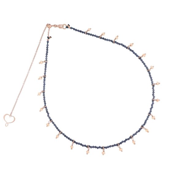 Girocollo chocker con pietre di Zaffiro e gocce di Perla pendenti realizzato in argento 925 con galvanica oro rosa ad alto spessore e resistenza. Il girocollo può essere regolato da un minimo di 31 cm fino ad un massimo di 42,5 cm grazie alla piccola sfera scorrevole. Inoltre è presente il cuore Maman smaltato di nero. Chiusura a moschettone.