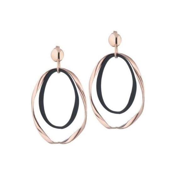 Orecchini Marcello Pane composti da piccola toppa ovale con perno e farfalla in argento 925 placcato oro rosa ed elementi ovali in bronzo rielaborati con un particolare rivestimento basato su un processo elettrolitico che conferisce una sensazione tattile simile alla Gomma di colore nero da cui il nome della collezione Rubber Black. Lunghezza orecchini: 4,5cm.