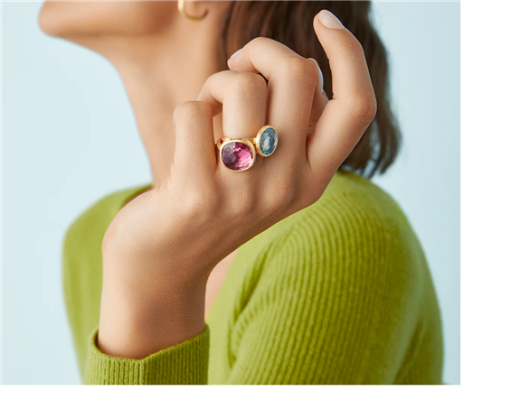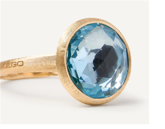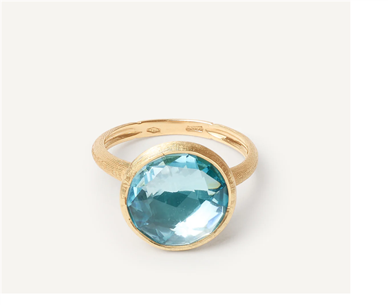 Un anello dalle linee essenziali e dal colore acceso. Impreziosito da un topazio azzurro accuratamente selezionato e incastonato in una ghiera in oro giallo 18kt, finemente incisa a mano con l'antica tecnica del bulino millerighe. Perfetto indossato da solo o abbinato alle altre nuance della collezione.