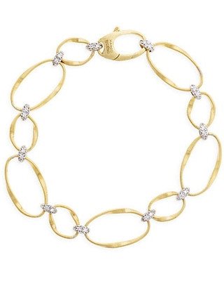 Questo bellissimo bracciale in oro giallo 18kt, è un girotondo di ovali in Spirale Ritorta uniti tra loro da sofisticati elementi in Pavé di Diamanti taglio brillante. Dall’eleganza discreta è un assoluto must have.