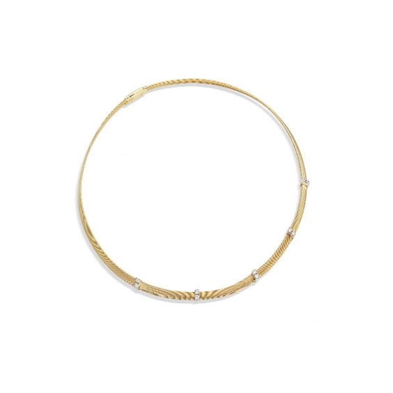 Un filo d’oro giallo 18kt, realizzato con la tecnica della Spirale Piatta e impreziosito da cinque barrette di Diamanti taglio brillante. Un girocollo dal design lineare e dall’eleganza senza tempo.